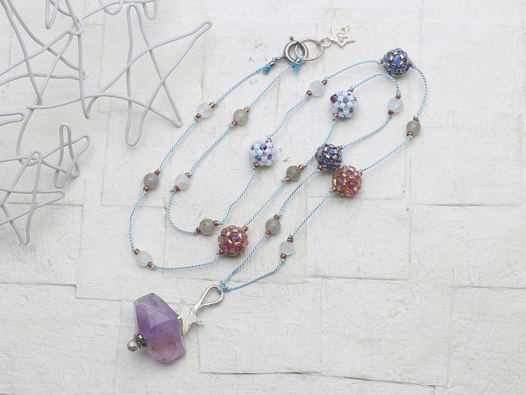 素材:アメジスト(ヘッド)、ラブラドライト(4㎜丸玉)、フロスト加工クリスタル(4㎜丸玉)、シルバー、メタルビーズ(ブロンズ)、デリカビーズ、綿糸、シルクコード