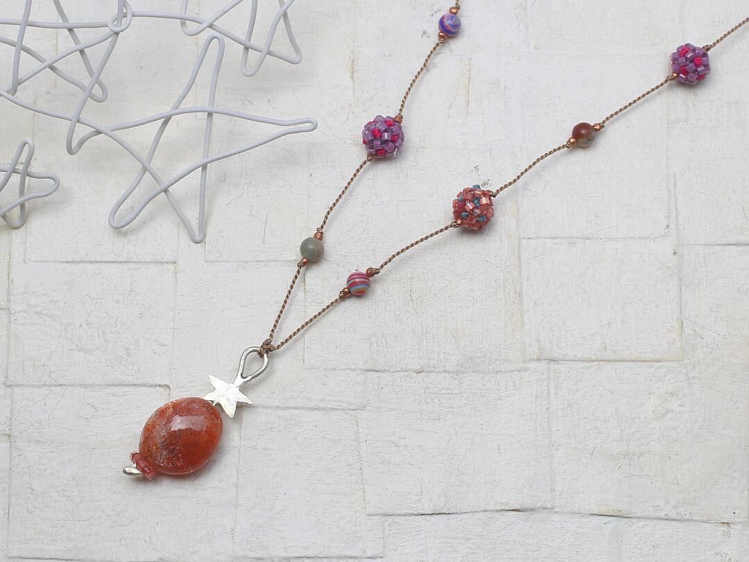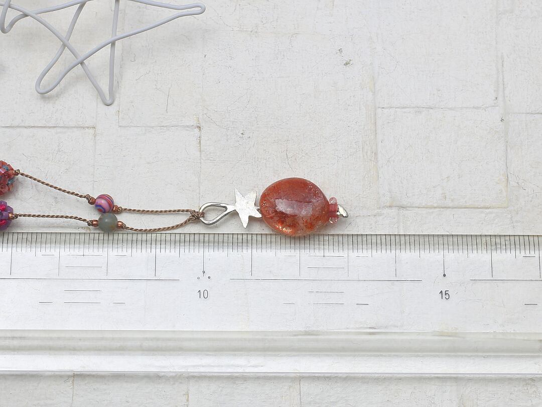 素材:サンストーン(ヘッド)、サーペンティン(4㎜丸玉)、ピンクミックスカラーアゲート(4㎜丸玉)、シルバー、メタルビーズ(ブロンズ)、デリカビーズ、綿糸、シルクコード