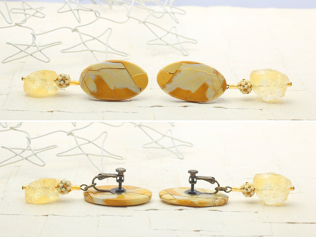 素材:ムーアカイト(ジャスパー)、シトリン(下がりの石)、デリカビーズ、丸大ビーズ、真鍮(金具 真鍮古美メッキ仕上げ)、樹脂