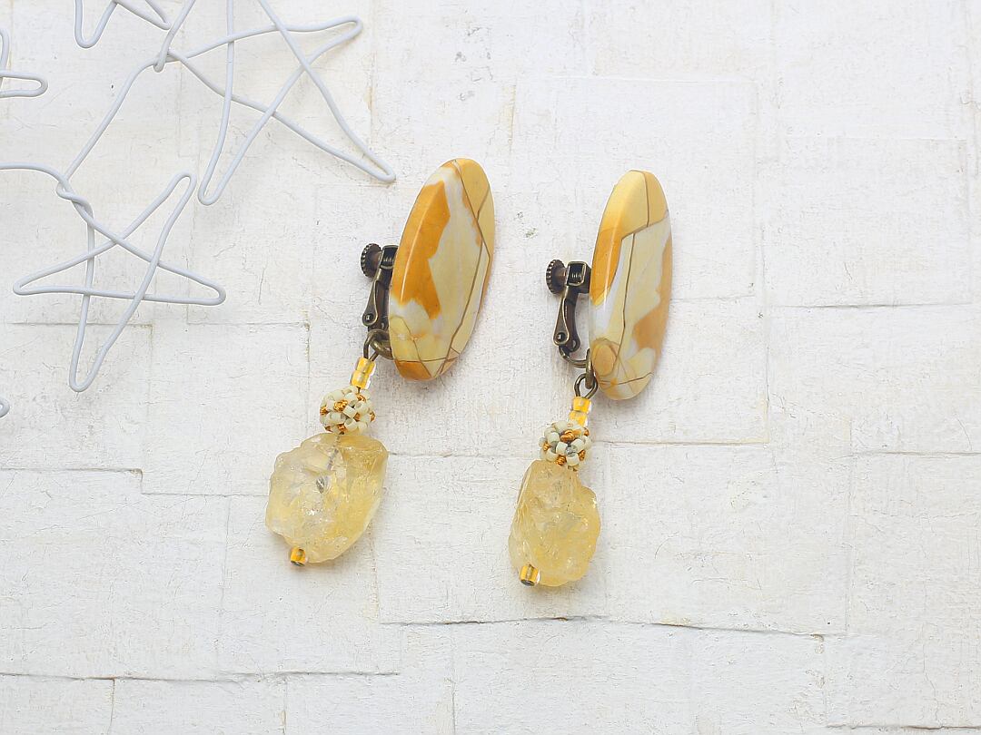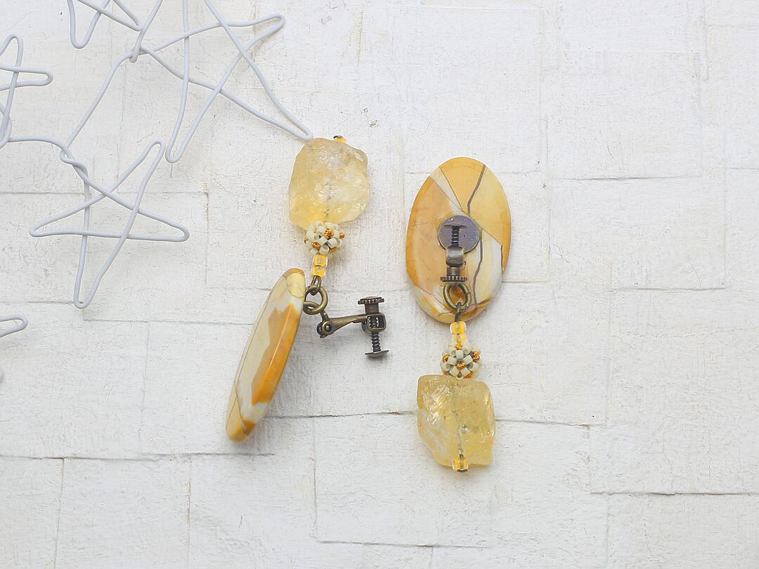 下がりにラフカットの砕いた氷のようなゴロっとしたシトリンと山吹色の刺繍で色付けした生成り色ビーズのころころパーツを下げてとても存在感のある大ぶりなイヤリングに仕上げました。
