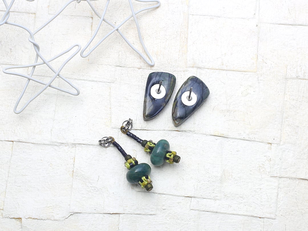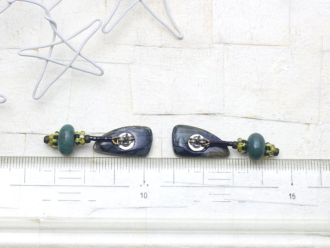 このピカソジャスパーの下がりには上下にビーズと黄色い糸で編み込んだキャップを付けたモスグリーンのインディアンアゲートをあわせました。