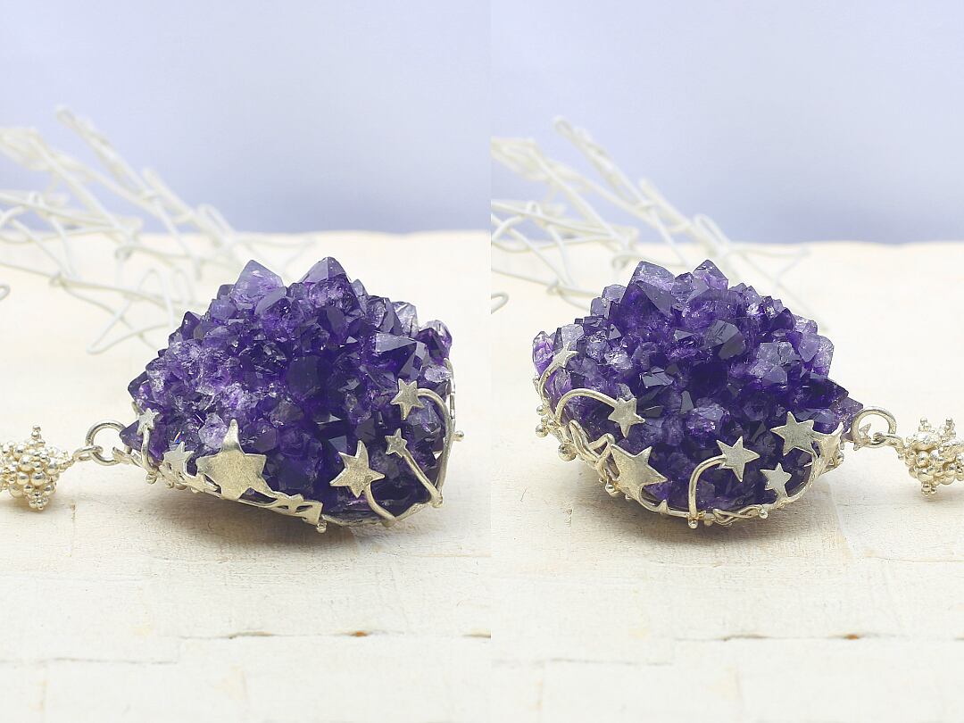 アメジストの上の立体的な星型シルバーパーツはツブツブをいっぱい作ってろうづけしてあります。