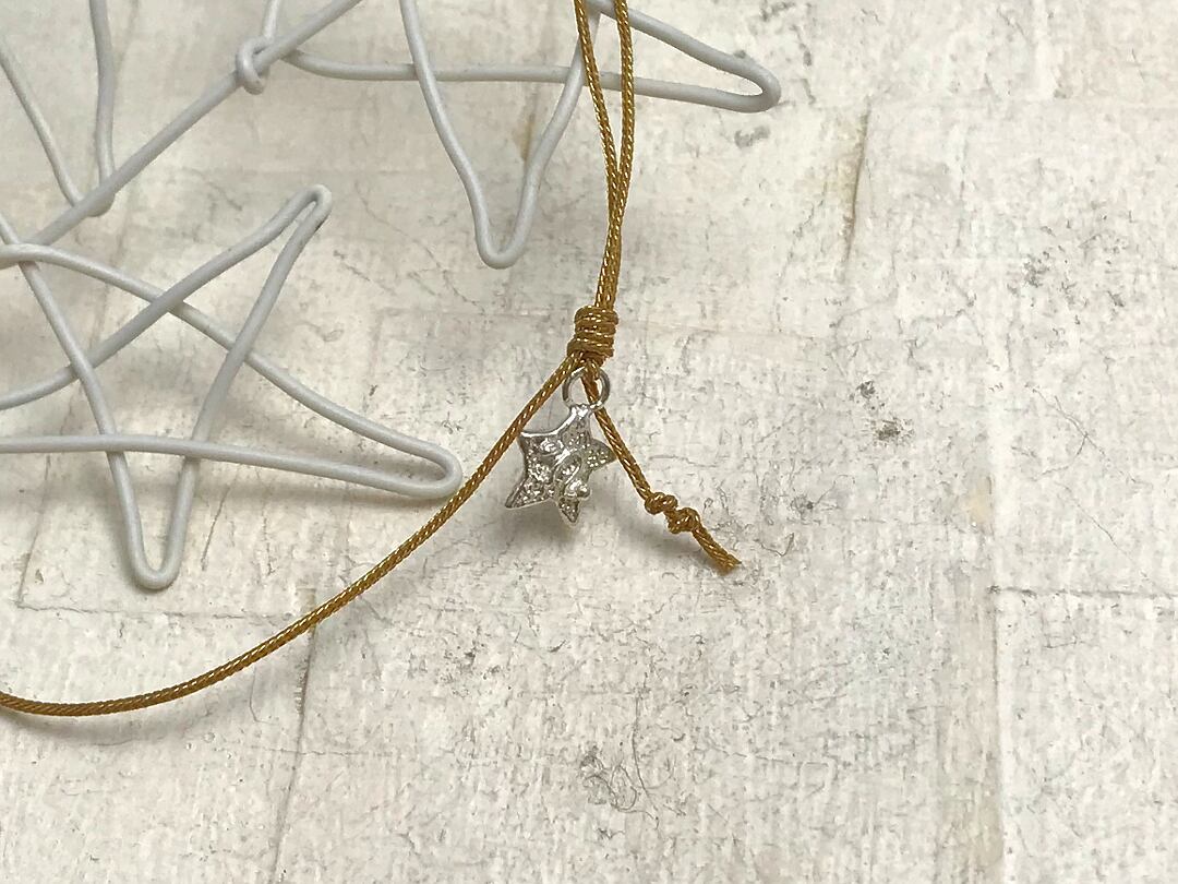 片結び目にはnohオリジナルのシルバープレートを付けてシンプルなブレスレットのデザインのアクセントにしています。