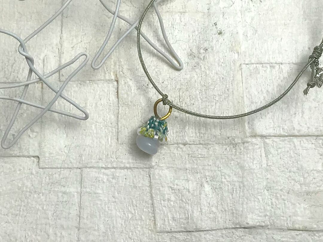 丸く作ったガラスの周りにビーズや色糸でキャップを作り、小さなどんぐりのようなのチャームしました。