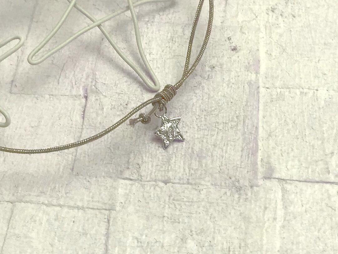 片結び目にはnohオリジナルのシルバープレートを付けてシンプルなブレスレットのデザインのアクセントにしています。