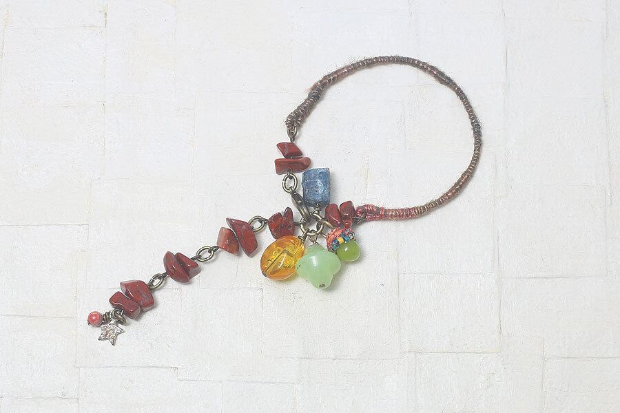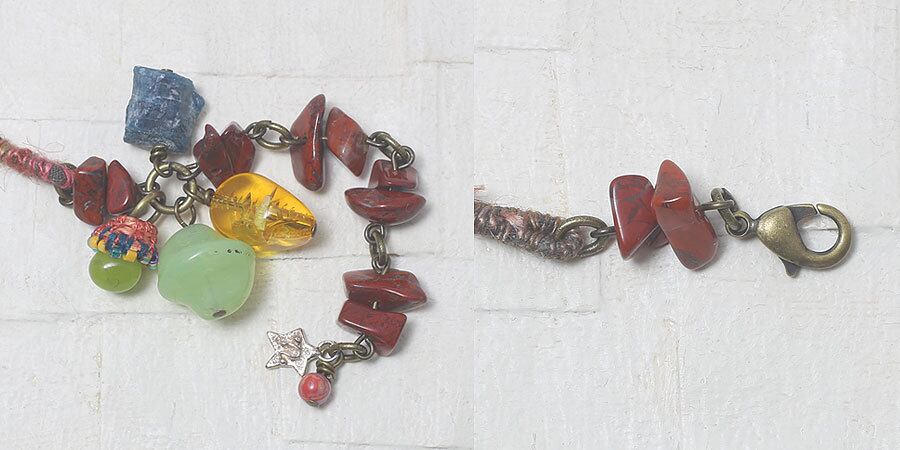 素材:ガラス シルバー、真鍮、デリカビーズ、インドビーズ、ブルーアパタイト、ジャスパー、カラーアゲート、綿布、綿糸、麻紐