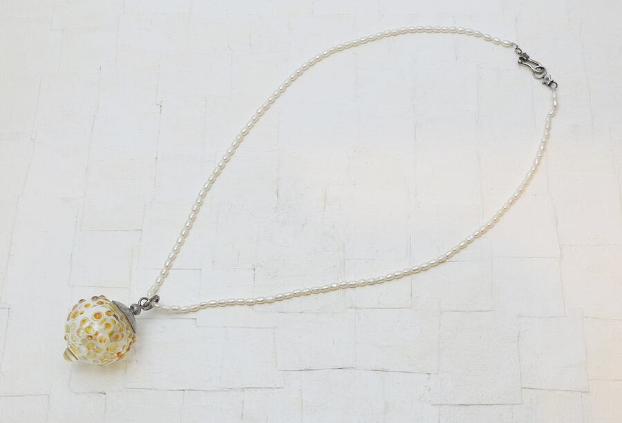 丸い空洞状のパイレックスガラスの胴体にシルバーの頭が乗っかったペンダント。