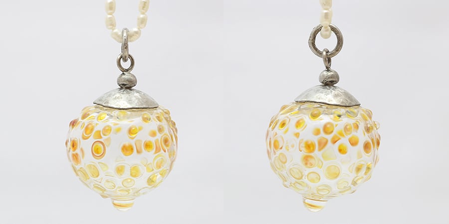 丸いガラスの中は空洞で、黄色やオレンジの色ガラスのつぶつぶが付いていてガラスの一番底はシズクが垂れそうな形になっています。