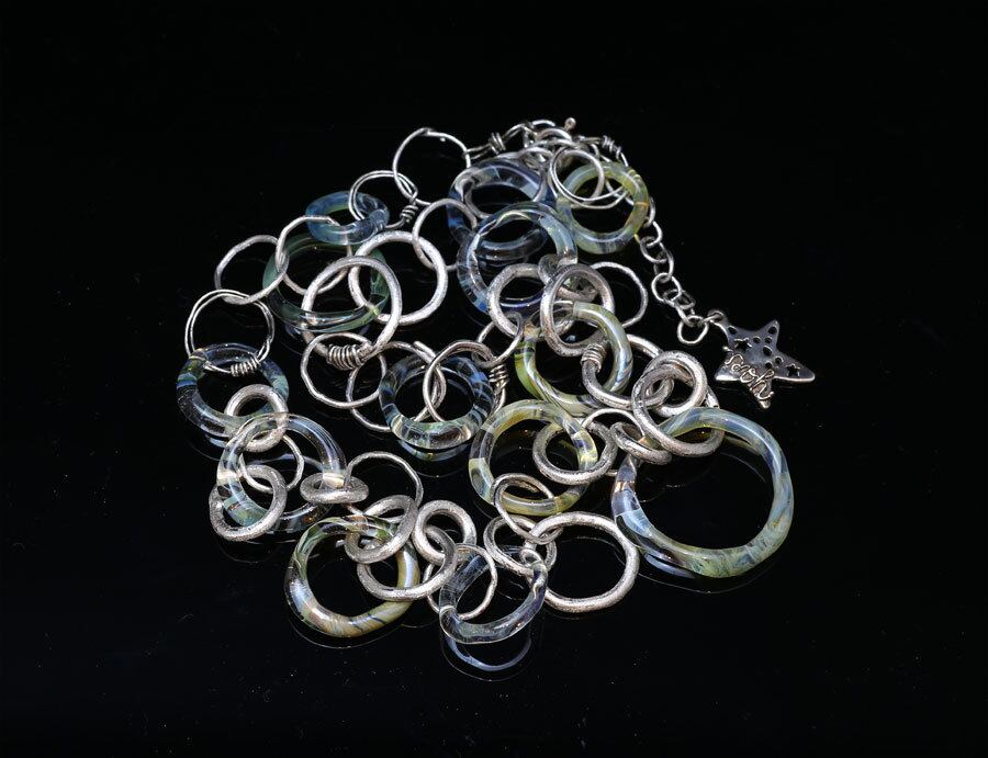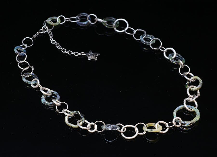 透明のパイレックスガラスに淡い何色かの色ガラスで模様を付けて大小色々な大きさの輪っかを作り、シルバーも様々な太さや大きさの輪っかをガラスの輪っかとつなげたネックレス。シルバーも丸線を切ってロウづけして一つ一つ作っています。シルバーの輪っかの地は荒らした仕上げになっています。
