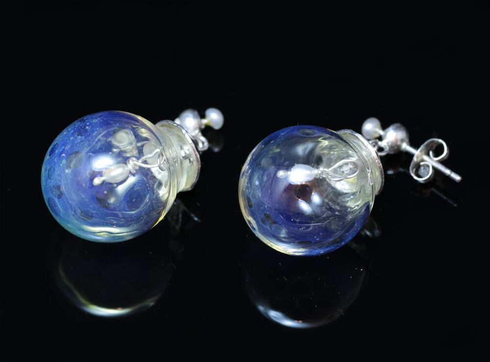 豆電球が揺れ動いたかのようなピアス。透明のパイレックスガラスを吹いて丸く膨らませています。フューミング(ゴールドやシルバーをガラスに吹きかける。ここではシルバーを吹きかけています。)という技法を用いてうっすらと青っぽいシャボン玉のような色合いが出るようにしています。(濃い色が背景になりますと青いシャボン玉のような色合いがよくわかります)
