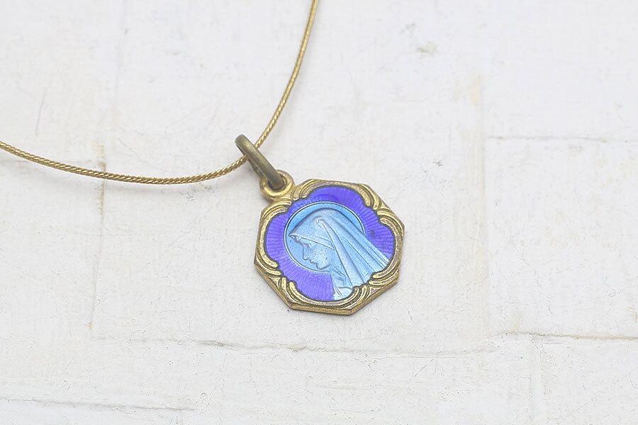 8角形の枠中心には聖母マリアの横顔が浮彫され、その上にはブルーのギロッシュ・エナメルが施されているとても凝ったデザインのペンダントです。ブルーのエナメルから美しいマリアが透けて見える様が神秘的です。