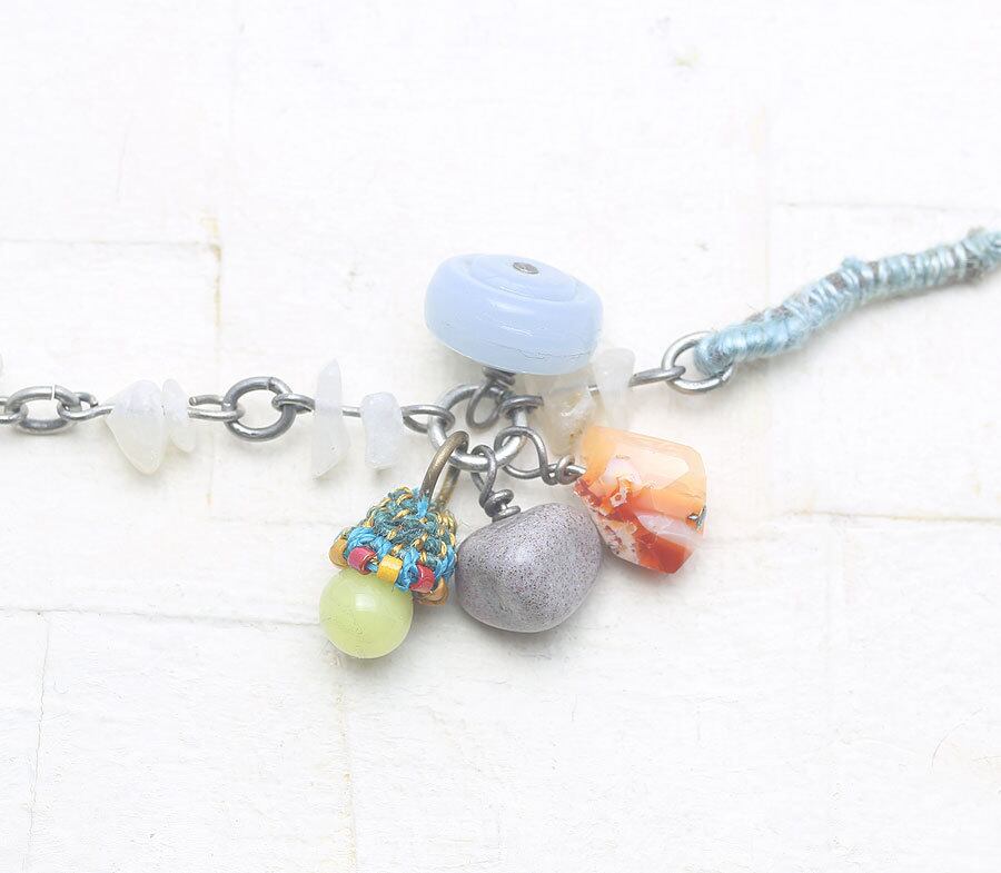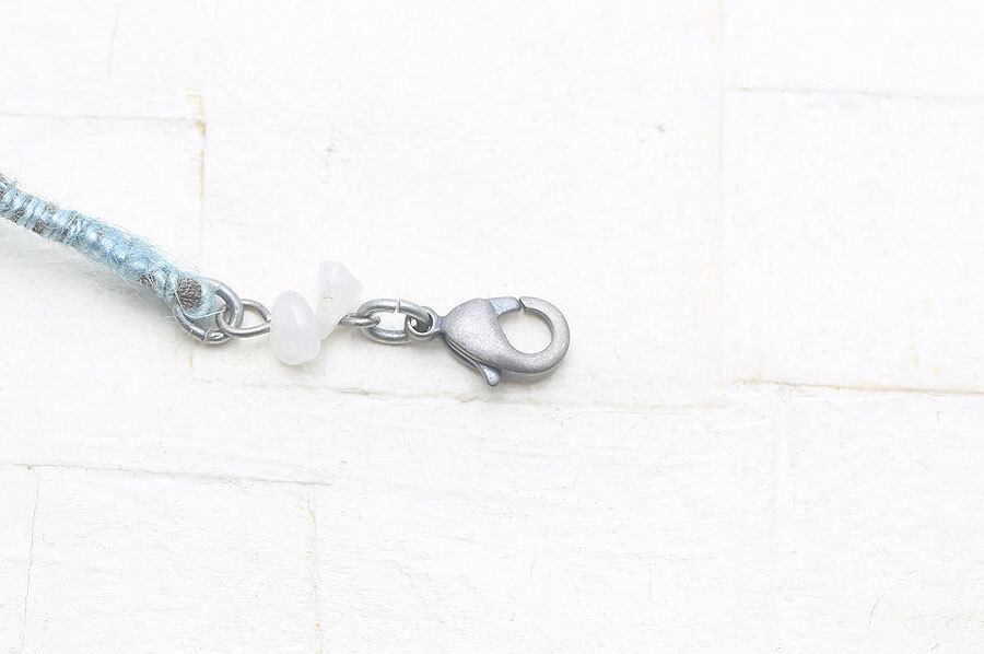 素材:ガラス シルバー、真鍮(銀古美メッキ)、デリカビーズ、インドビーズ、ファイヤーオパール、インディアンアゲート、トルコ石、ムーンストーンさざれ、綿布、綿糸、麻紐