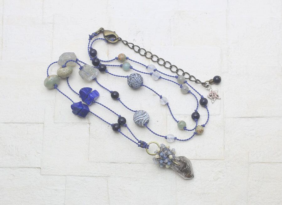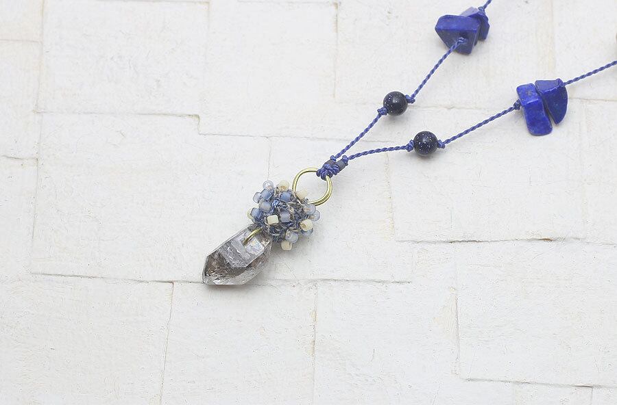 素材:クリスタル(ダブルポイントクリスタル天然形状)、ブルーサンド(4mm丸玉)、ラピスラズリ(さざれ)、サーペンティン(4mm丸玉、ボタン型)、ラブラドライト(4mm丸玉、ラフロック)、メノウつや消し(8mm丸玉)、クラックフロストクォーツ(4mm丸玉)デリカビーズ、 シルバー(星プレート)、真鍮、綿糸、綿布、コード
