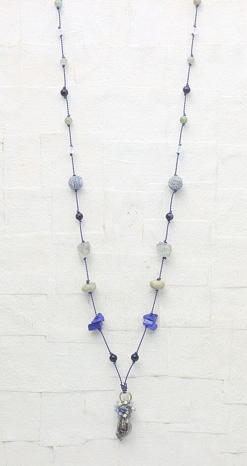 ネックレスの紐はヘッドに合わせブルーのコードを使用していて色々な天然石を飛ばしてあります。全体的にブルー系とナチュラルカラーでまとめました。